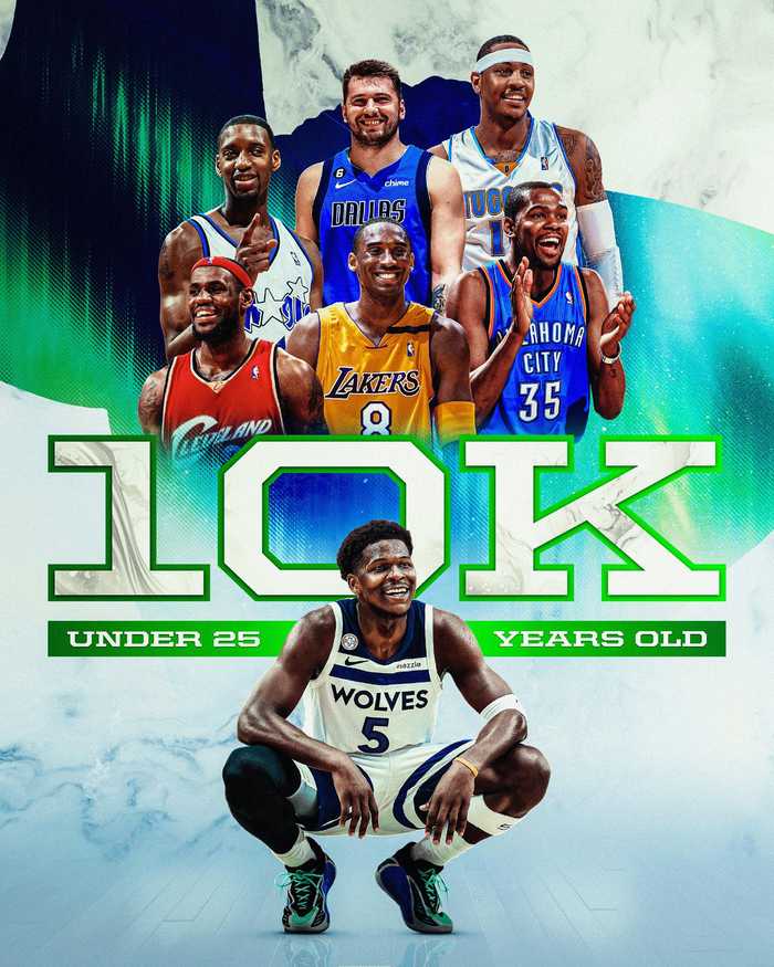 今天24岁156天的爱德华兹成为历史上第七位25岁前就得到10000分的球员,也是第三年轻的球员。最年轻的10000分球员是詹姆斯(23岁59天),杜兰特第二年轻(24岁33天)。
